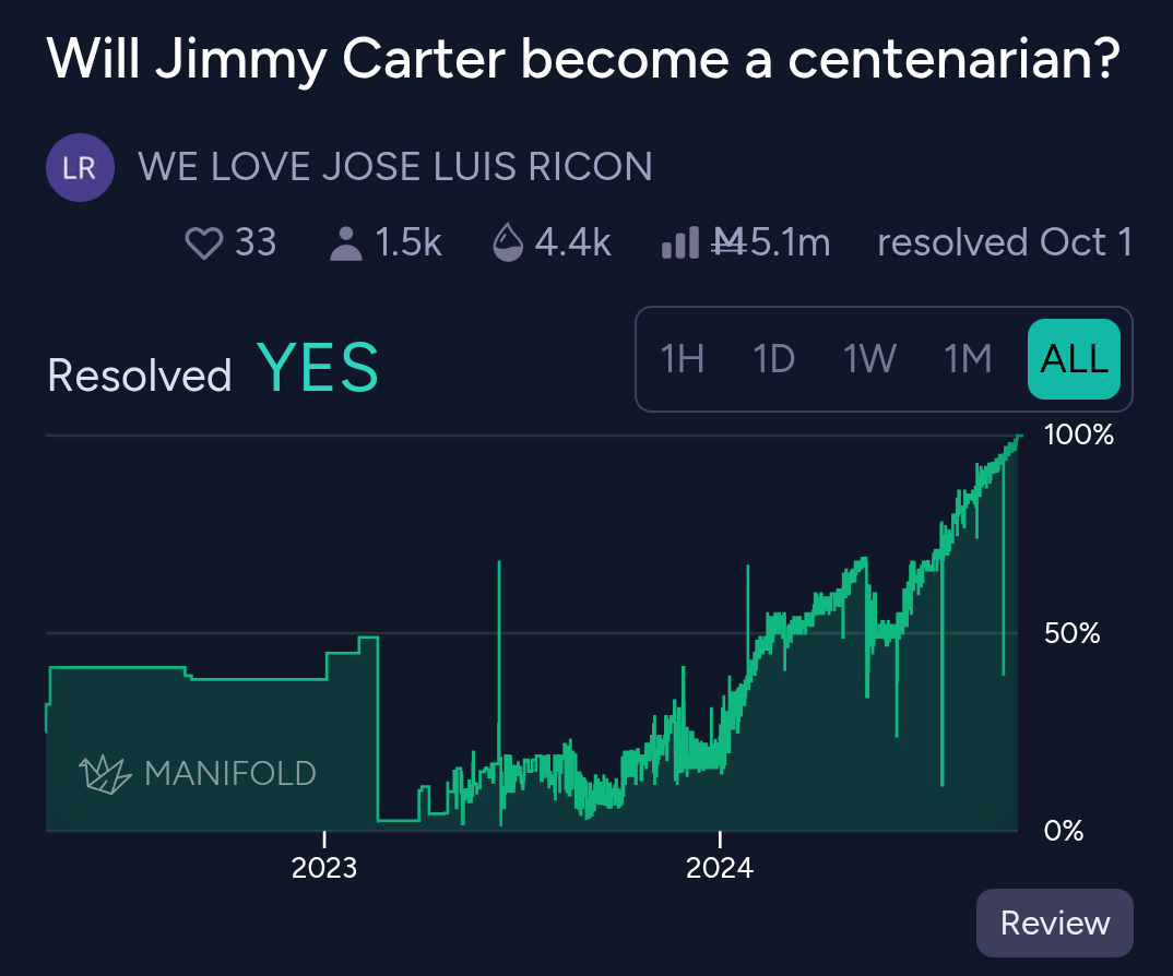 @AlvaLindqvist There was a period of Manifold circa 2023-2024 when we were all (maybe unhealthily) obsessed with when 39th President of the US, Jimmy Carter, would die.
