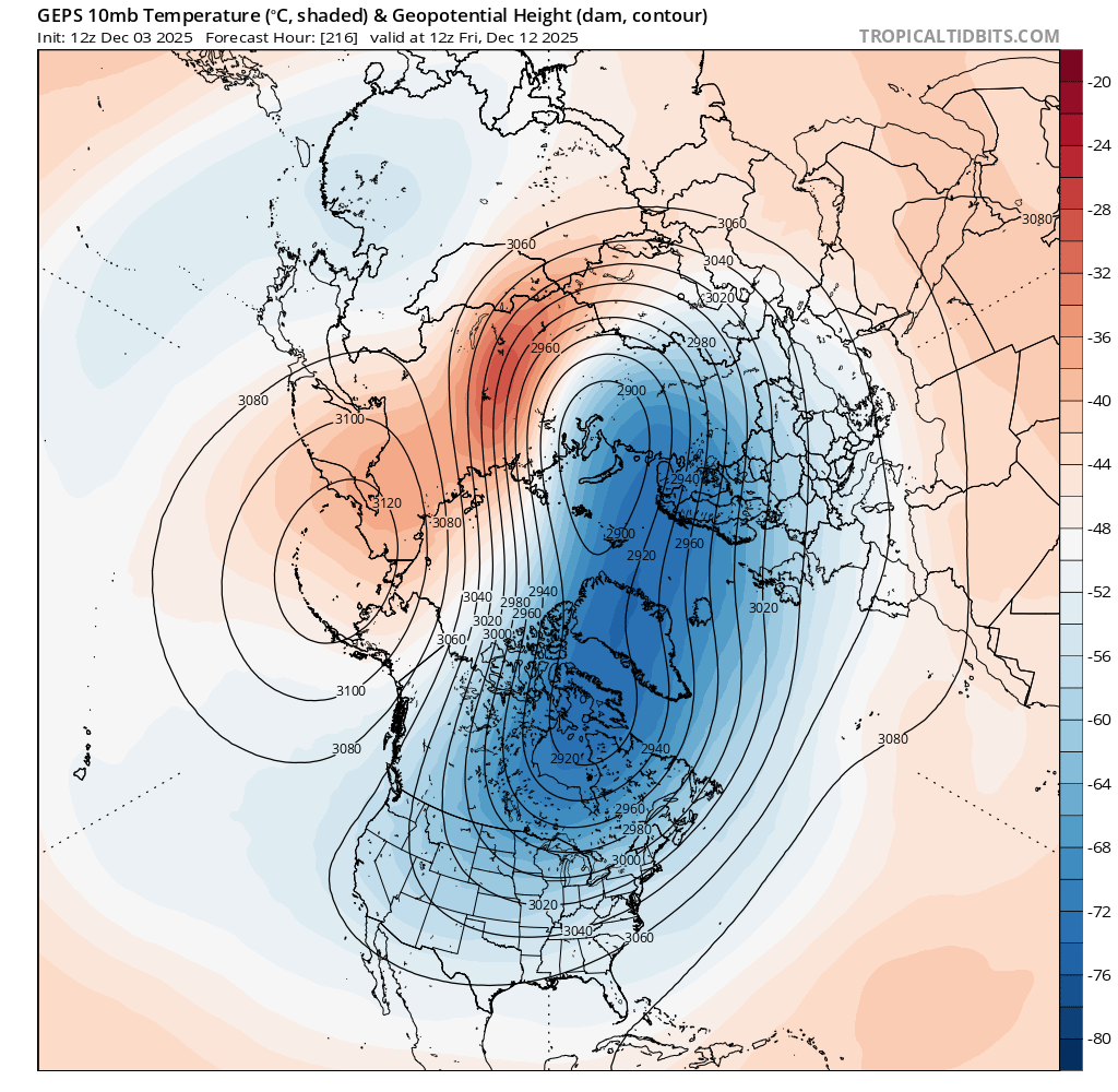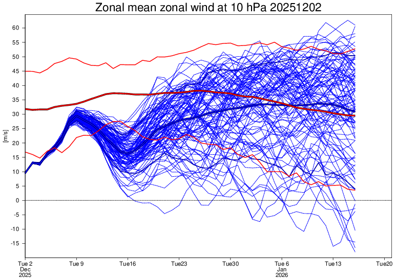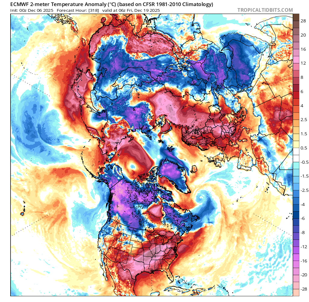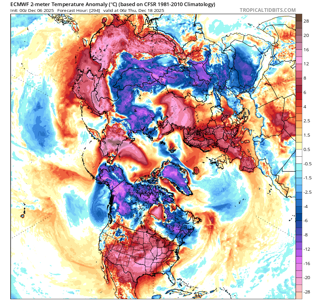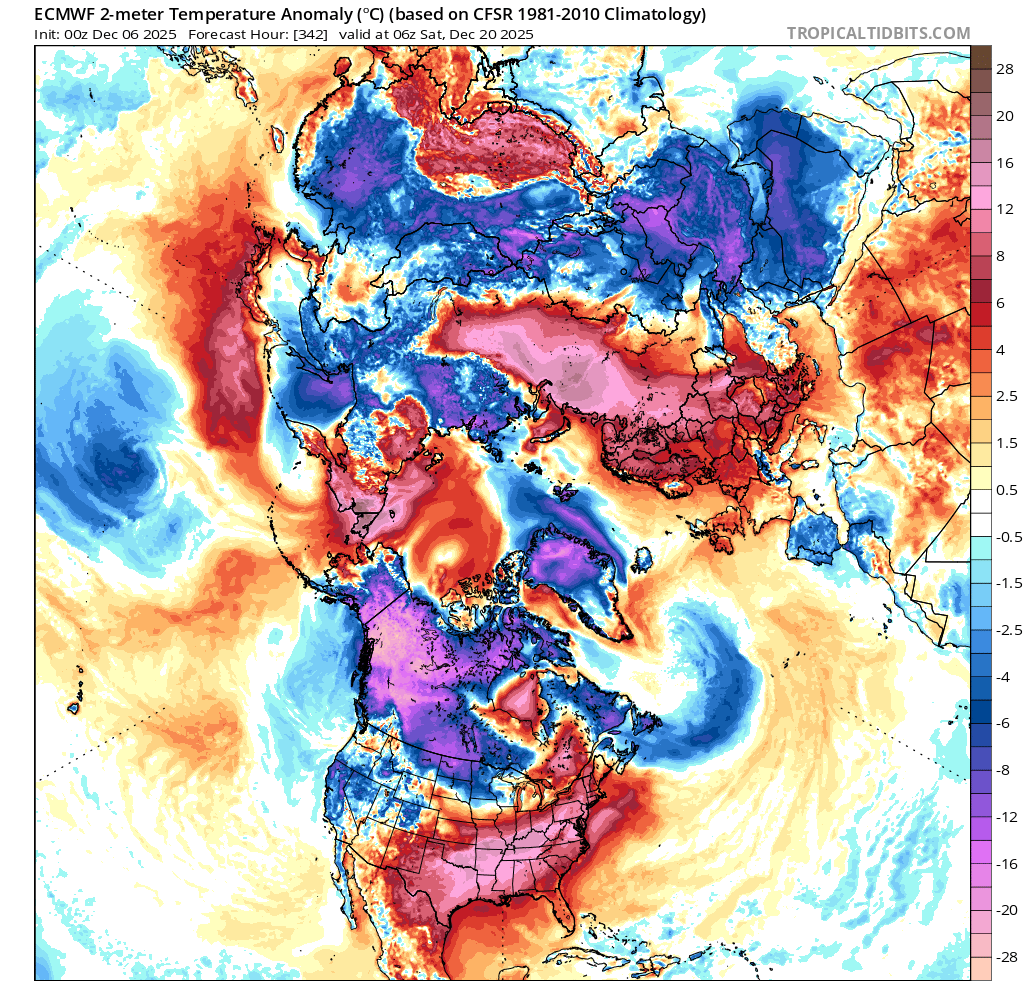 The Arctic SSW forecasted for the end of the last month didn't validate and it ended up as a Canadian Warming instead (resulting in a stretched polar vortex); something similar may happen again seems to be forecast for the middle of the month (although its very far out) with the vortex getting temporarily stretched again (a dip in the stratospheric winds). So at least for the NH I am speculating the second half of December will be roughly as anomalous as the first half of December.